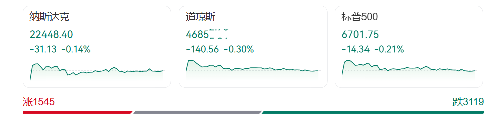 3月18日,美股三大指数全线低开,截至发稿,纳指跌0.14%,道指跌0.3%,标普500指数跌0.21%。全市超3100股下跌。
